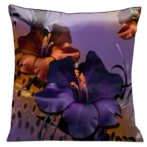 Lama Kasso Chocolate Royale Deep Purple and Copper Gladioli with Animal Print Accents on a Purple Satin 18-Inch Square Pillow, Design on Both Sides
