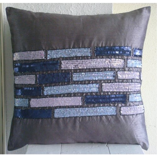 Purple Bricks - Decorative Throw Pillow Cover. This pillow cover is made using a Purple Art Silk Dupioni Fabric intricately embellished with sequins and beads in different shades of purple and blue to create a beautiful bricks on the pillows. The back of the pillow is the same purple Silk Dupioni fabric with a flap covered zipper for clean look and easy removal. This pillow cover is available in Size 12x12 inches, 14x14 inches, 16x16 inches, 18x18 inches, 20x20 inches, 22x22 inches and 24x24 inches. Note: This Pillow Cover Design can be Customized in Other Sizes. Send me an email on urvi@thehomecentric.com with your request. Made In India under strict Quality & Environmental standards.